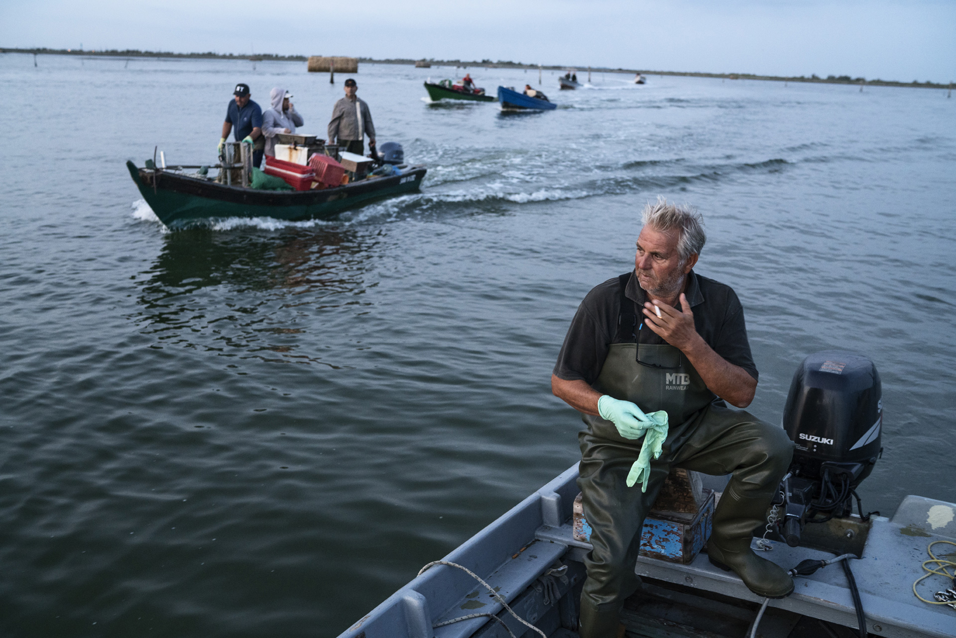 Un’imbarcazione del consorzio di pescatori si muove con lentezza, controllando che tutto stia procedendo secondo il regolamento; queste sessioni di pesca sono riservate ai soci del consorzio e organizzate periodicamente in base alla domanda di vongole del mercato locale e italiano. Ogni socio ha una quantità massima che può raccogliere per la mattinata (oggi sono venti chili) e un prezzo che varia a seconda del periodo; gli anni difficili della pesca alle vongole sono passati – negli anni ’90 la lotta ai pescatori abusivi e gli scontri tra cooperative rivali causarono diversi morti – ma gli interessi sono ancora forti, perché si tratta di una delle attività più redditizie di un Delta dove la pesca diventa sempre più difficile. Ecco perché, al fischio dei responsabili del consorzio, la quiete diventa caos, il borbottare dei diesel diventa un ruggito mentre si accendono i rastrelli a motore che risucchiano le vongole dal fondale fino alle casse sulla barca, dove uno o due persone operano una prima cernita, eliminando i molluschi troppo piccoli.