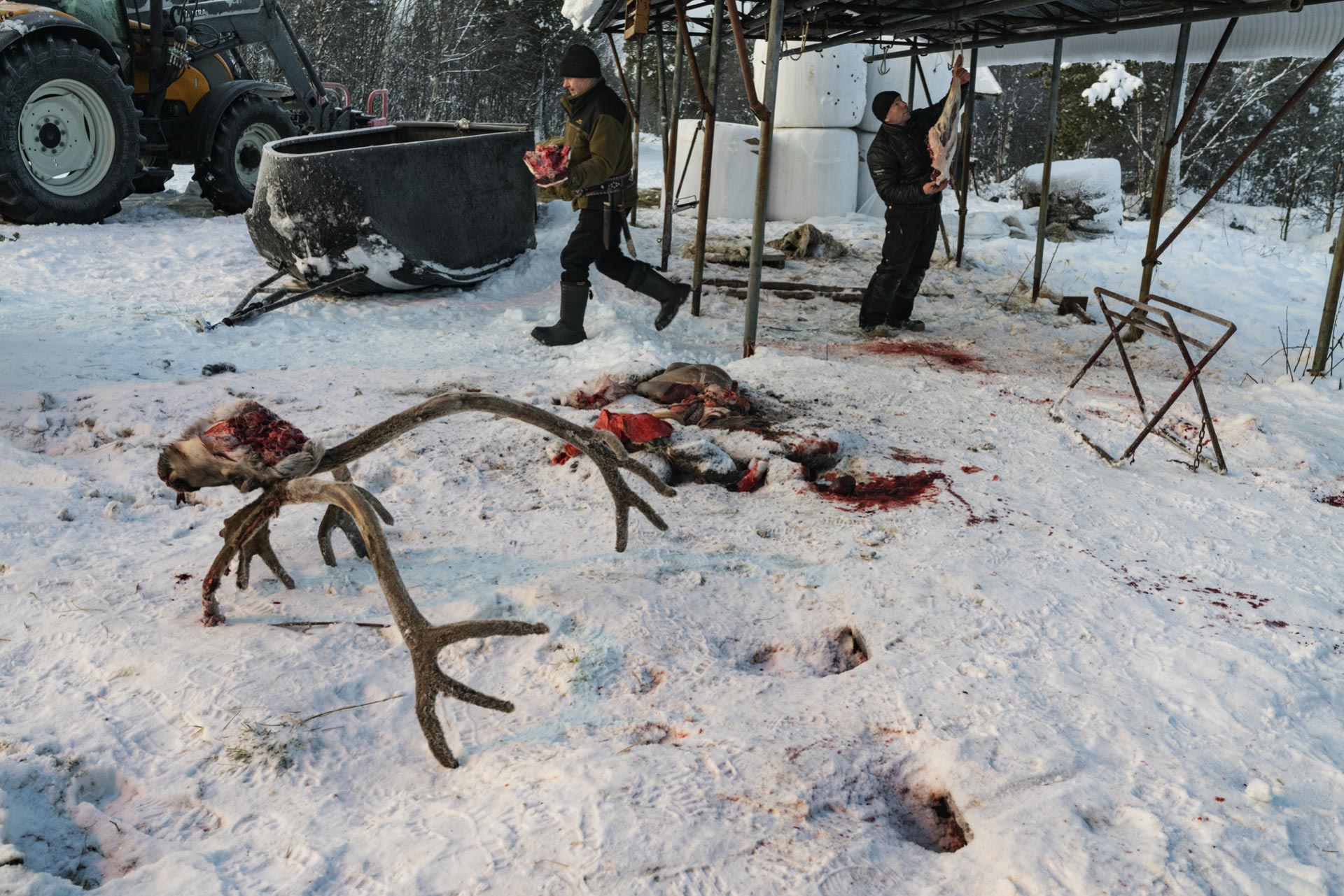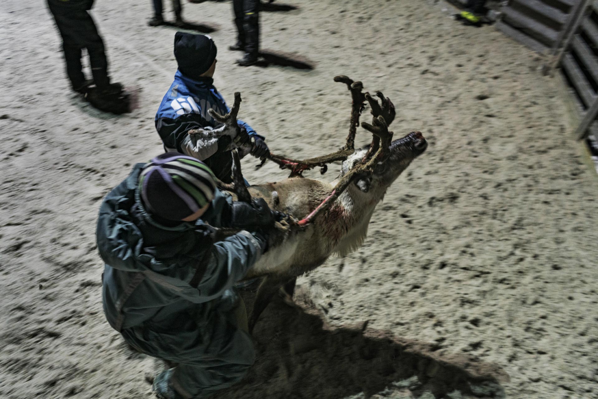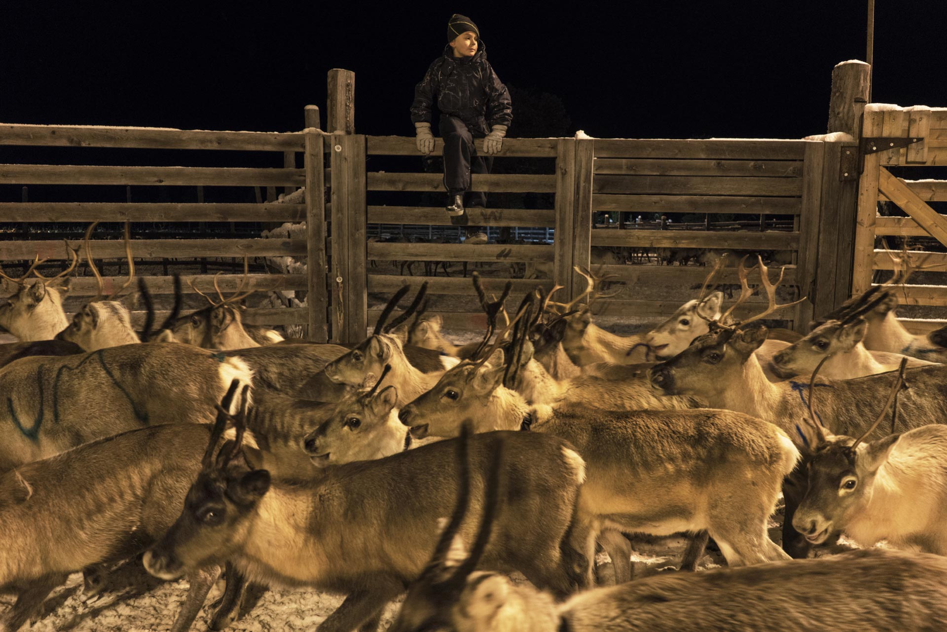 Mentre il figlio dirige il branco dall’alto come un direttore d’orchestra, suo padre Penti si dirige verso un recinto dove sono già state portate alcune renne, e a cui deve dare da mangiare. “Sono magre, molto magre” dice un po’ sconsolato una volta entrati, spargendo prima pellet legnosi, che le renne usano per attivare lo stomaco, e poi un fieno dall’odore forte, acre. Le renne lo circondano, mansuete, come fossimo in una stalla piena di vacche. Penti però non le accarezza, non le tratta con la familiarità di un animale addomesticato: la loro anima è selvatica e tale deve rimanere. Per un sami vedere una renna in un recinto è una sofferenza a tratti necessaria, ma che deve durare il meno possibile. L’idea di tenerle sempre in uno spazio chiuso, foraggiandole ogni giorno, è inaccettabile, ma il cambiamento climatico rischia di renderlo necessario per molti in Lapponia. “La scorsa estate è stata caldissima, fino a trenta gradi. E molto secca” dice Penti. “Le femmine sono deboli, e hanno generato piccoli altrettanto deboli. Alcune hanno deciso di non procreare, proprio perché sentivano di non averne la forza”. Gli chiedo cosa si aspetta dall’inverno. Penti rimane in silenzio pensando a una risposta mentre lancia grandi manciate di muschio; un odore di bosco copre il lezzo del fieno mentre le renne, dopo aver quasi ignorato il resto del cibo, si contendono questo a spintoni e cornate. “Se sarà un inverno duro, le più deboli moriranno. Dovremo vendere i giovani al macello. Sarà un momento difficile per noi.”
