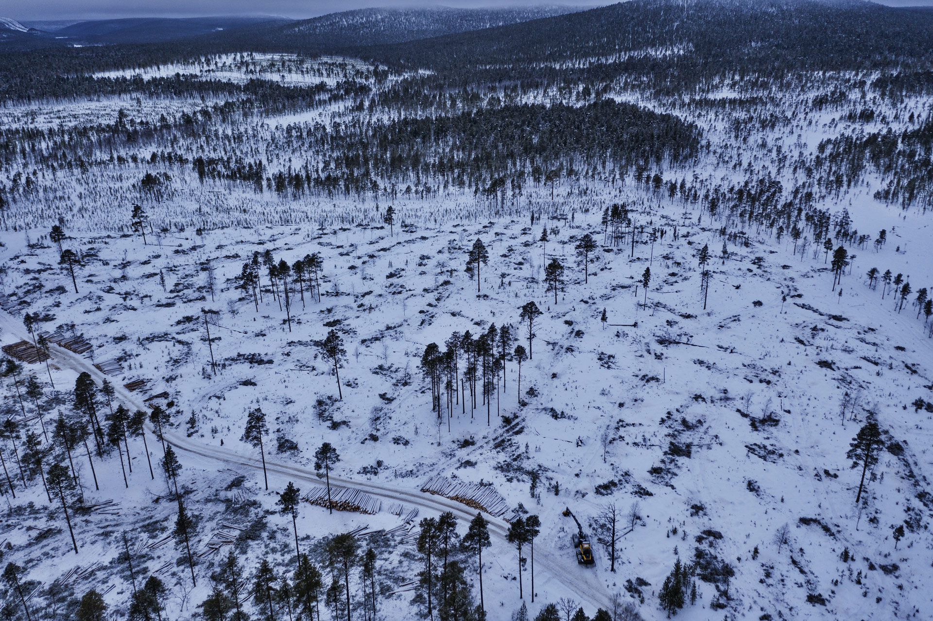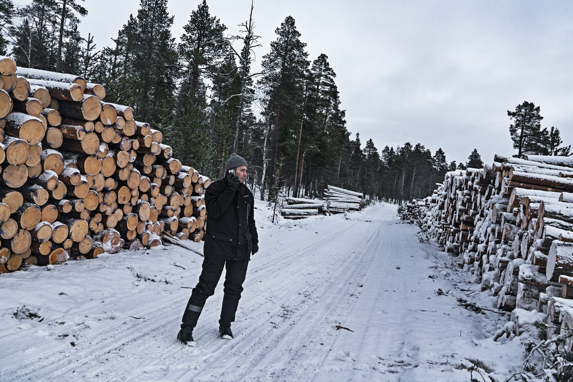 Vuole mostrarci i danni inflitti dalla compagnia Inarin Yhteismetsä che secondo lui taglia ancora foresta primaria, nonostante il divieto seguito alle battaglie sue e di Greenpeace. Ma arriviamo troppo tardi, quando ormai la foresta non c’è più. Davanti a noi c’è solo un orizzonte sgombro, punteggiato da qualche albero lasciato in piedi – una decina in totale su oltre un chilometro quadrato – e dalle cataste di legna già coperte da un sottile strato di neve. L’harvester, la macchina per il taglio rapido dei tronchi, giace quieta in un angolo, le sei ruote gigantesche intrappolate nelle catene spesse come un polso. Lì sopra si trova un taglialegna che, una volta accortosi della nostra presenza, si affretta a raggiungerci. A differenza di quanto ci aspettavamo non ci aggredisce; è un signore settantenne che inizia invece a raccontare la situazione a Jarmo con calma e solo una punta di fastidio. Spiega che quella mattina è arrivato un consulente che lavora per la compagnia intimandogli di interrompere il taglio, perché forse è condotto in zone dove sarebbe proibito e potrebbe portare alla revoca della concessione. Si sono dovuti così fermare subito dopo, limitando il disboscamento all’area che abbiamo davanti: 80 ettari, un’enormità per i nostri occhi, troppo poco per lui che, come tanti altri taglialegna, viene pagato per ogni metro cubo di legna tagliata.